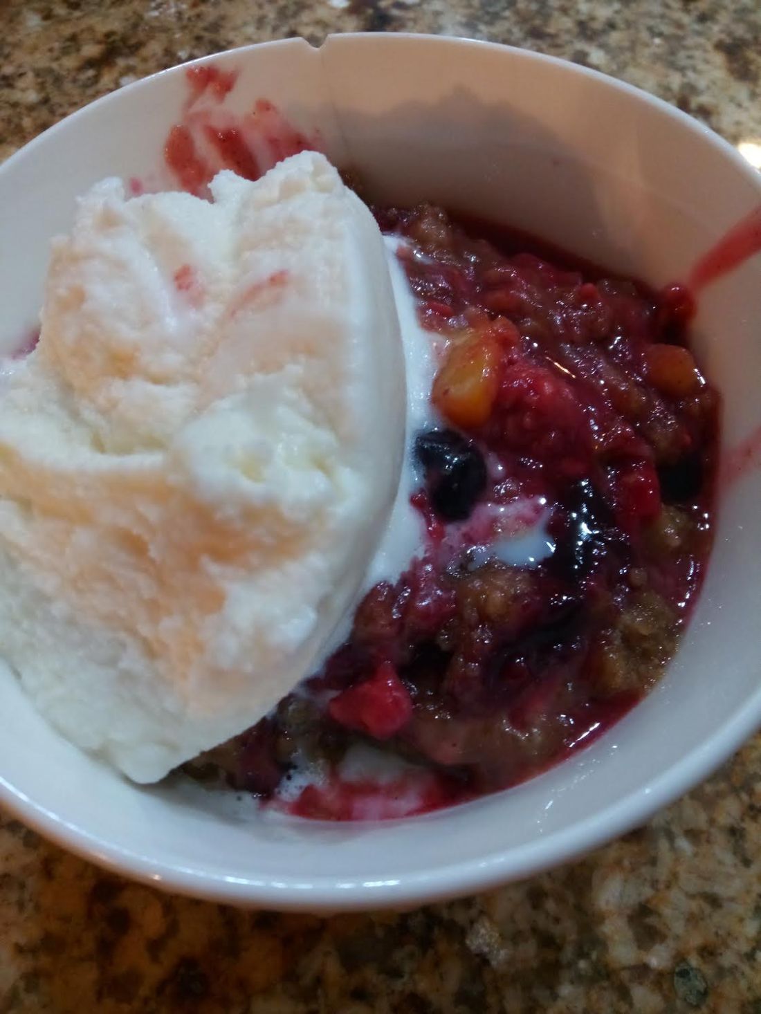 This fruit crisp is delicious, especially in the fall months. Serve it fresh out of the oven with some vanilla ice cream and everyone will love it. You can also substitute the peaches and blueberries for other fruits, but I find the peach and blueberry combination to work very well.